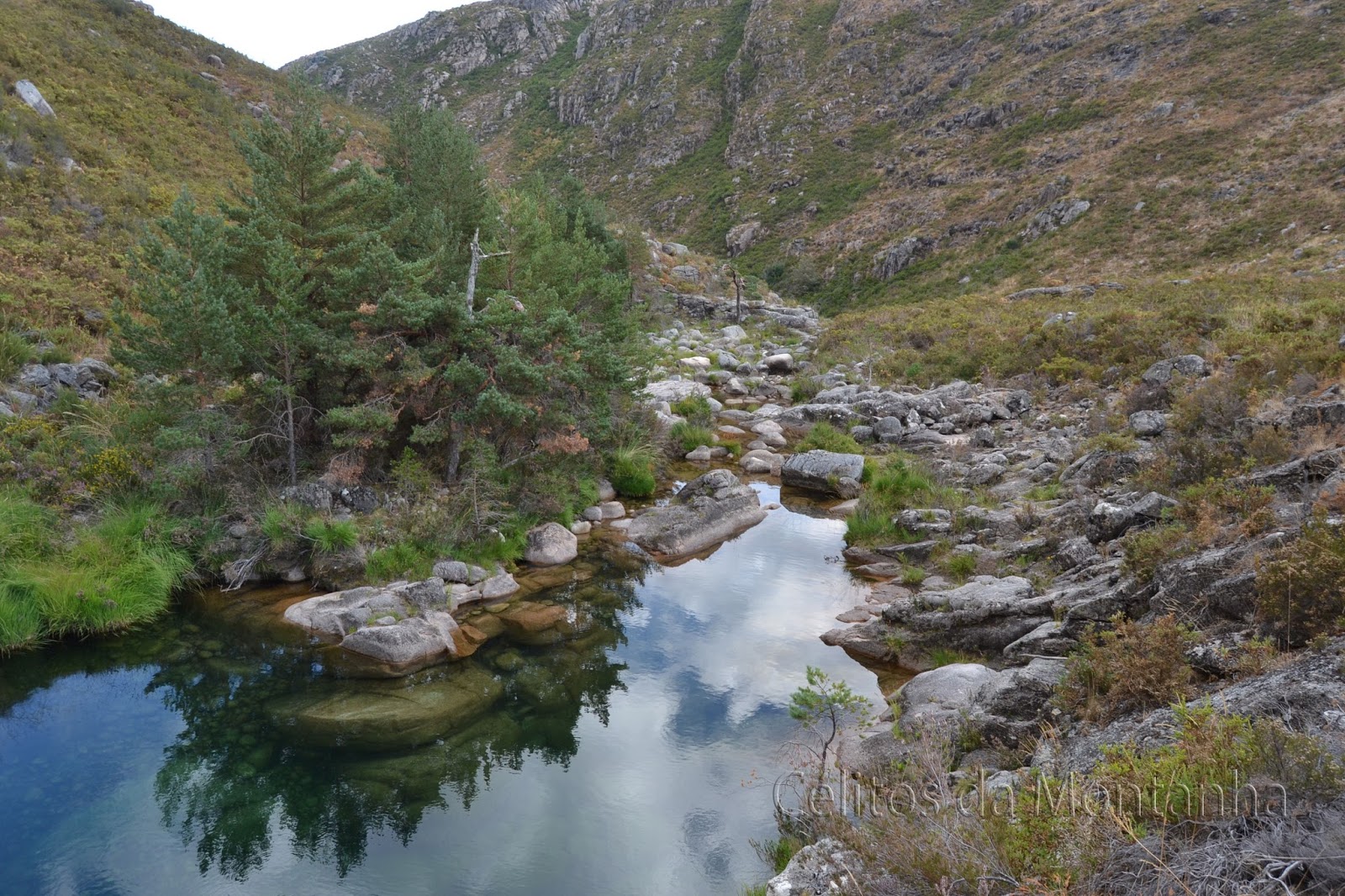 Depois de muitas fotos pois a paisagem de 360ª ( Pitões, Paúl, Outeiro, Biduiça, Nevosa, Compadre Currachã, Paradela, Matança entre tantos outros) tão maravilhosa a isso levava decidimos mesmo almoçar no seu topo. Como era cedo e não tínhamos destino resolvemos contornar lugar pela vertente Este (Cornos de Candelas) a meia encosta seguindo novamente umas tímidas mariolas por um caminho que quase de certeza era trilho de animais, mas que se fazia bem. Depois de contornar encosta decidimos ir tomar um banho no Poço Dola para refrescar e descontrair e brincar um pouco com os famosos peixinhos mais conhecidos por Escalos o que fizemos durante algum tempo. Como tempo passava seguimos novamente em direção a Entre Caminhos pelo trilho assinalado e daqui foi descer até Abelheira onde terminamos trilho.